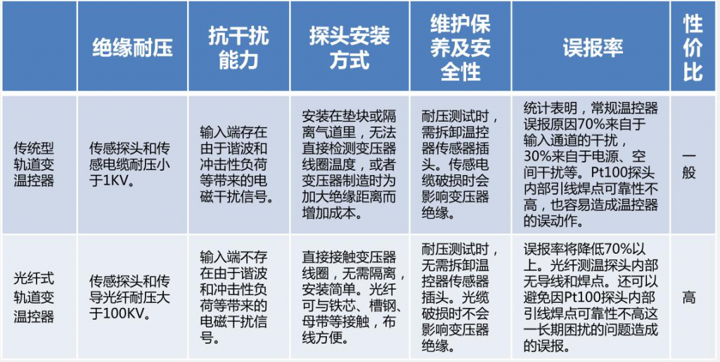 以傳統(tǒng)型軌道交通溫控器與光纖式軌道交通溫控 器的應(yīng)用做對比,如下表: